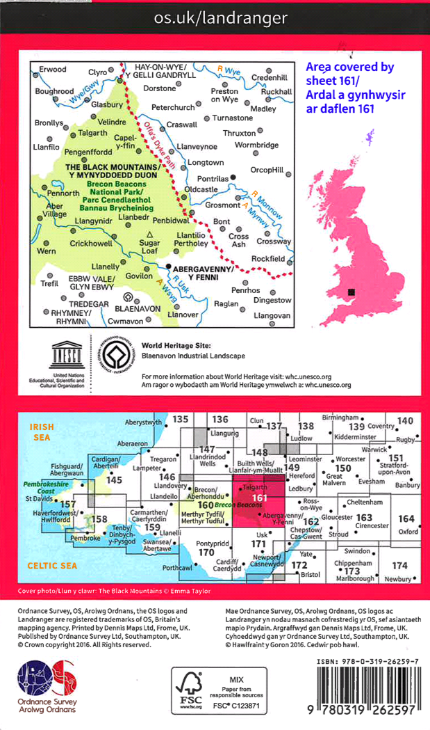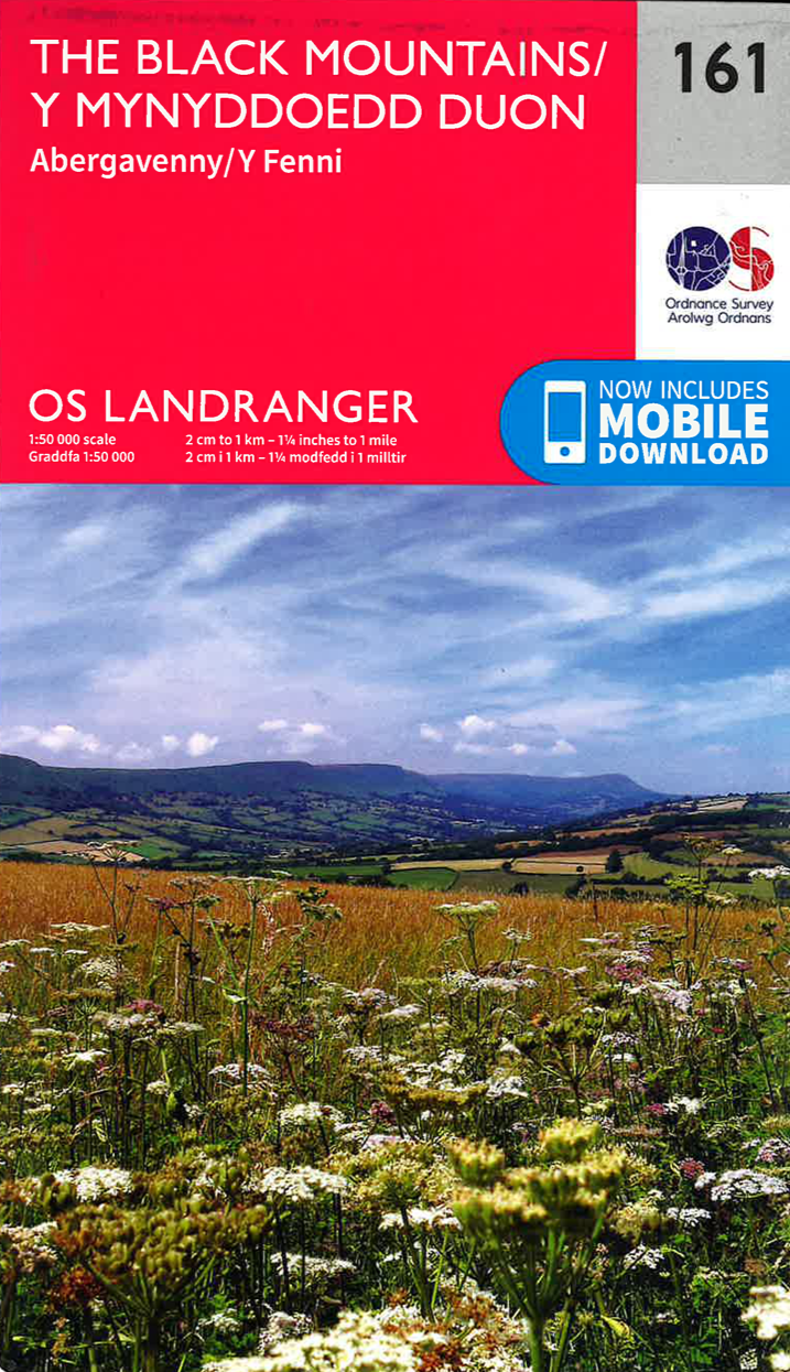 OS Landranger series map number 161 covering the Black Mountains and Abergavenny to Hay-on-Wye in the north.